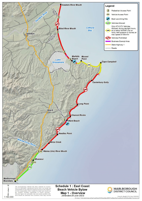 The Marlborough District Council East Coast Beach Vehicle Bylaw prohibits most vehicles on beaches from the Awatere River mouth south to the Waima/Ure River mouth. Exceptions include designated boat launching areas and a specific “yellow zone” for ATVs/UTVs, and all vehicles are banned from dunes and reefs. Non-motorised activities, such as walking, cycling, and horse riding, remain unrestricted.